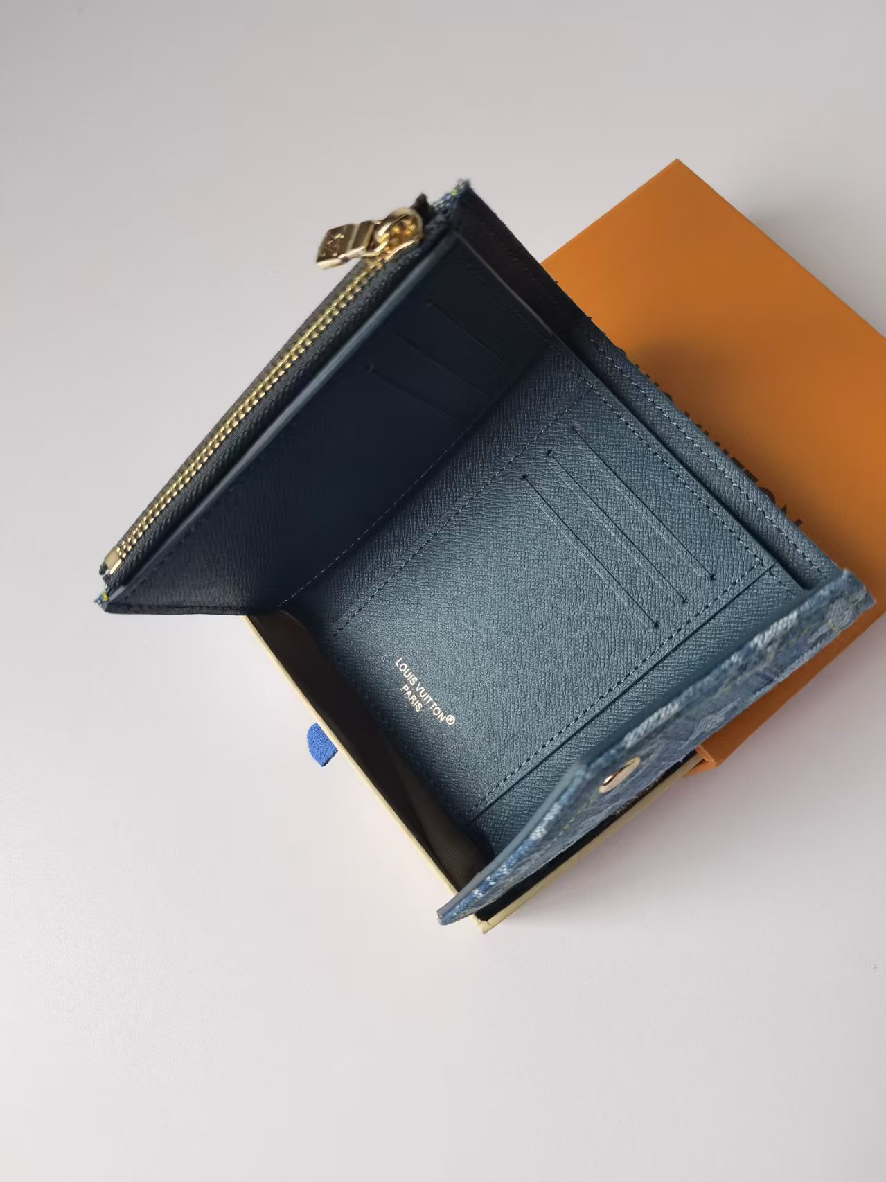 This Victorine wallet is made of denim fabric. Its compact design offers ample space for easily storing banknotes, coins and cards. Size: 12*9.5*1.5cm